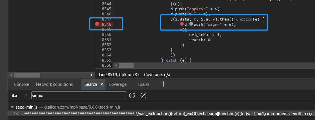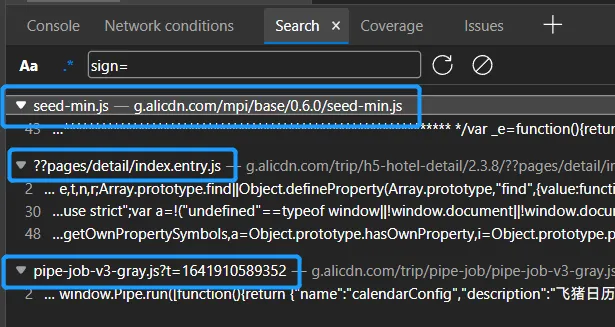 可以看到有三条疑似给sign签名赋值的三个js文件,这时候需要根据逆向经验去猜测源码应该会使用哪个去进行sign签名的赋值和加密。但如果没有逆向经验的判断,也可以对搜索出来的三个js文件可疑的代码段进行同时断点,逐个查看分析。