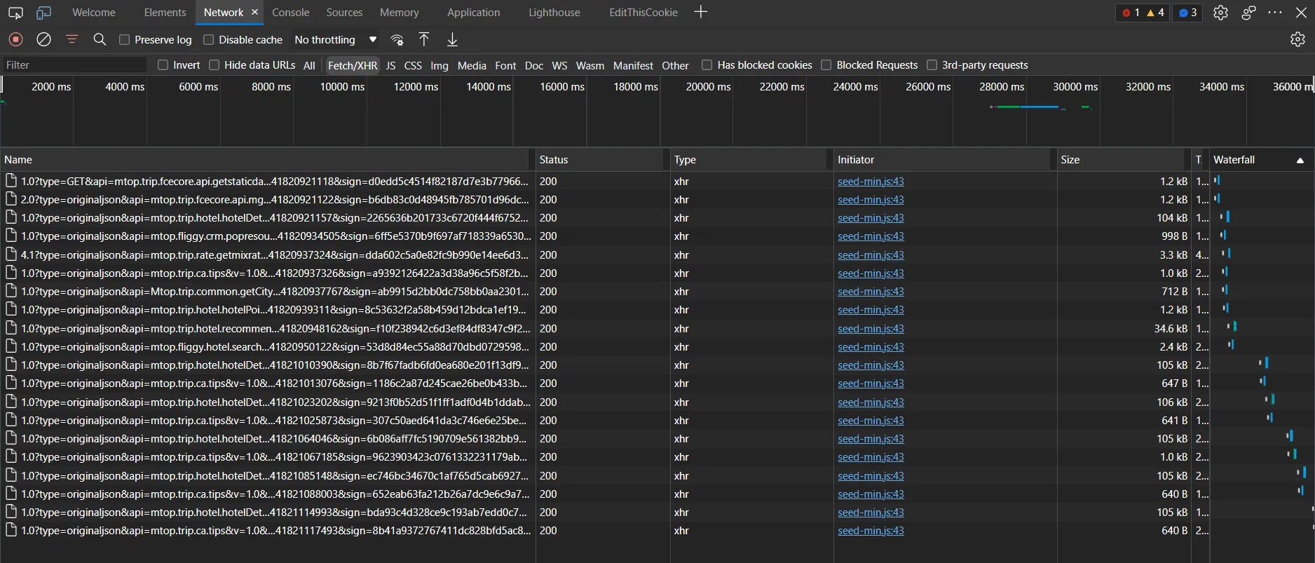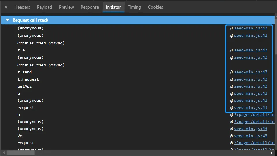其实可以在Network(网络)选项卡的请求项中查看Initiator里的Request call stack,往往最后出现最多次的js文件,即是请求加密所执行的js文件。在这里,出现最多次的是seed-min.js文件,我们锁定它,然后进行代码段的断点。