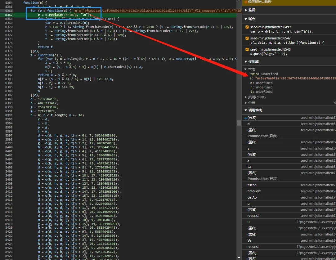 在8548行做一个断点,重新刷新页面,让前端重新请求一个数据包并把它断点截获。