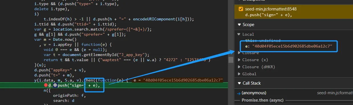 断点被捕获后,在Sources(源)选项卡中,查看被断点后时的Scope(本地变量)和CallStack(调用栈),通过这两个信息顺藤摸瓜到加密函数的入口处。