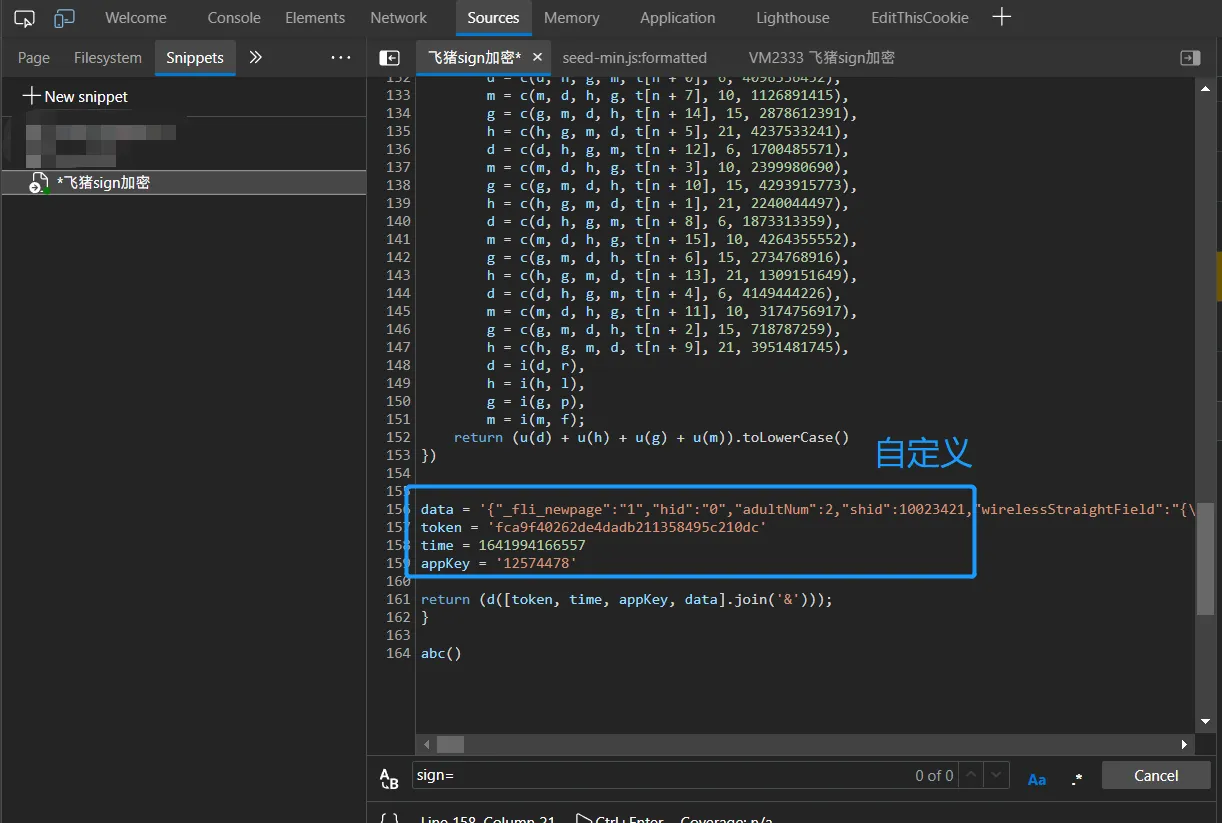 在Sources(源代码)选项卡左侧的Snippets(代码片段)Tab页中新增一个代码片段,将sign签名方法复制到里面将其保存,并且复制将4个关键参数传入到方法中,然后点击运行(Ctrl+Enter)。