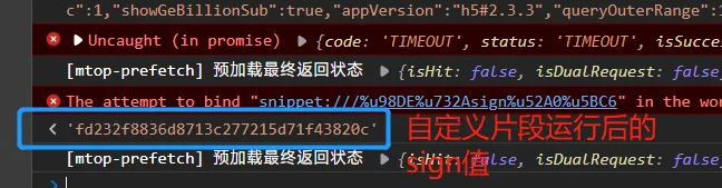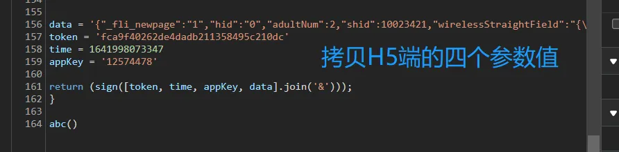 重新发送一个请求,然后将H5端真实发送的四个参数的值分别复制到自定义参数中,查看H5端生成的sign值是否与自己新建的代码片段运行的值是一致的,若是一致的则表示该sign签名函数可被使用。